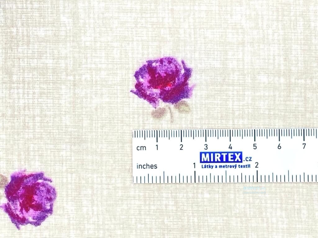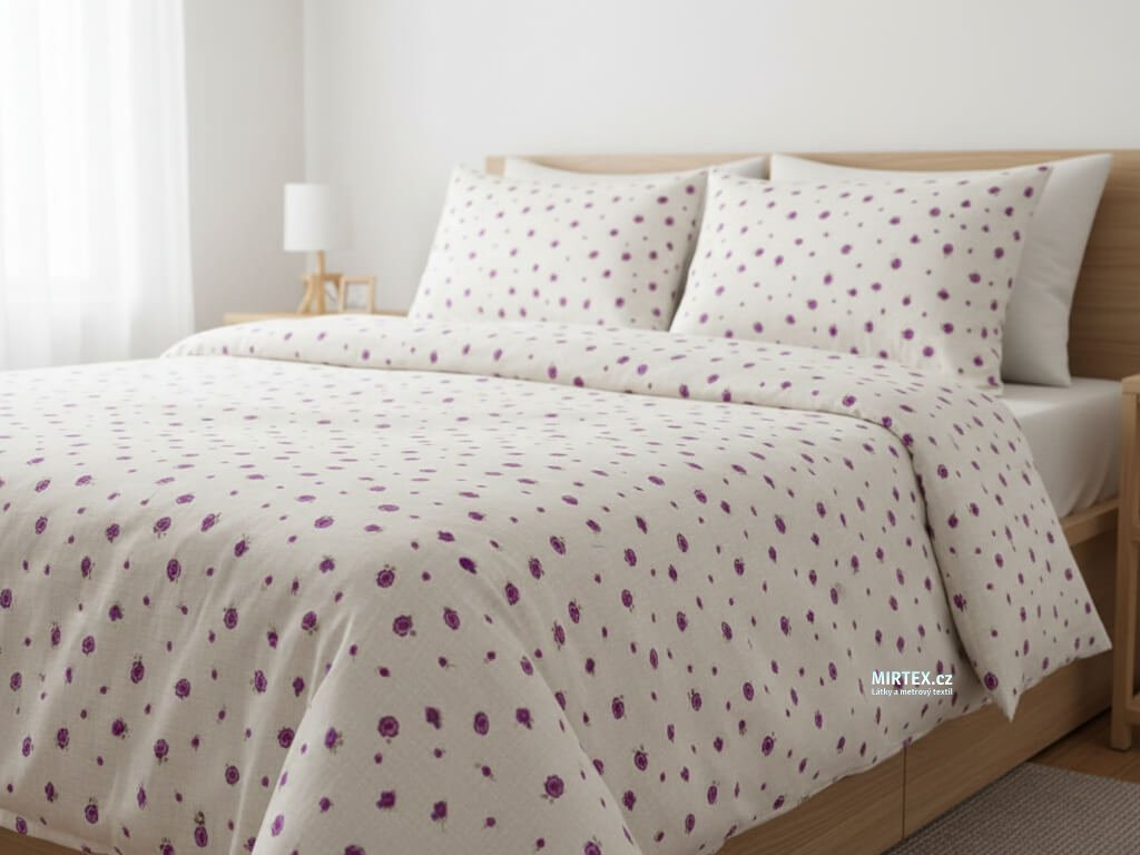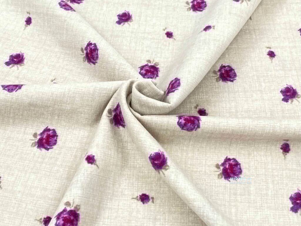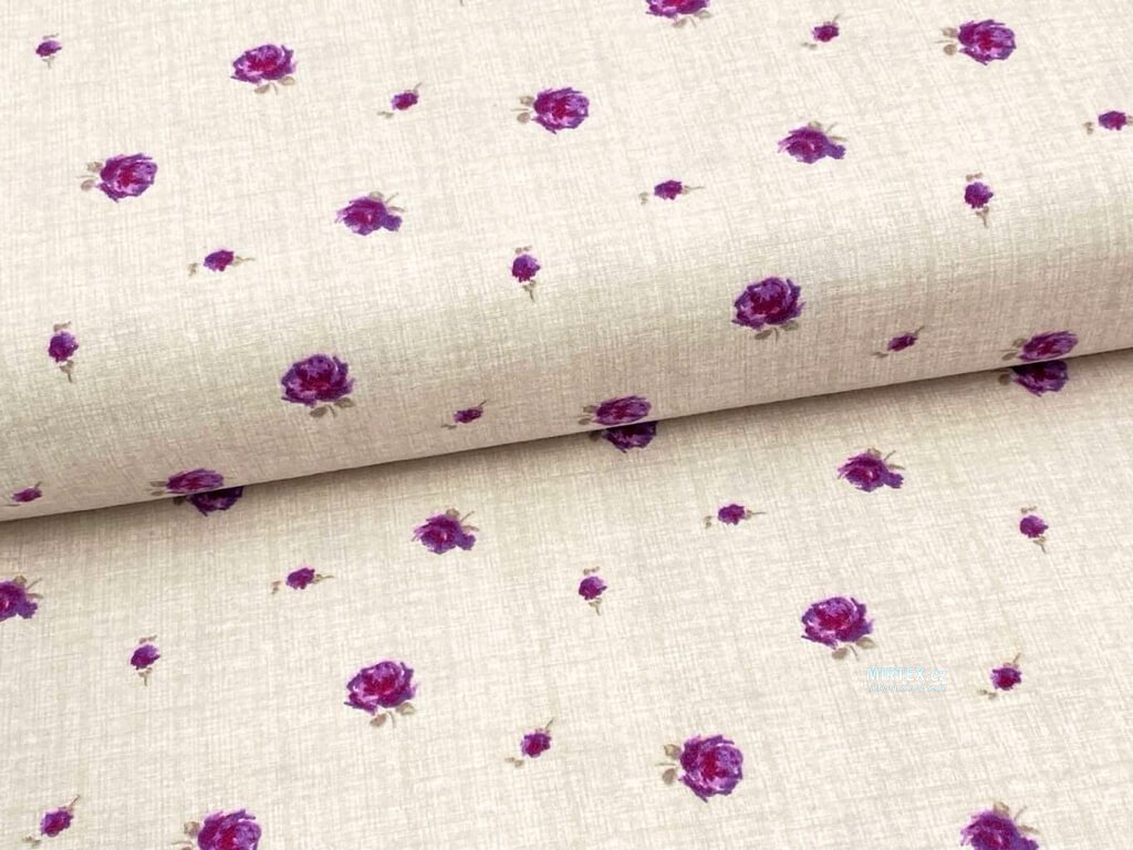 Barva a vzor: Drobné fialové květy na světle béžovém podkladu, vytvářející jemný a romantický design, ideální pro dekorativní textilie s elegantním nádechem.