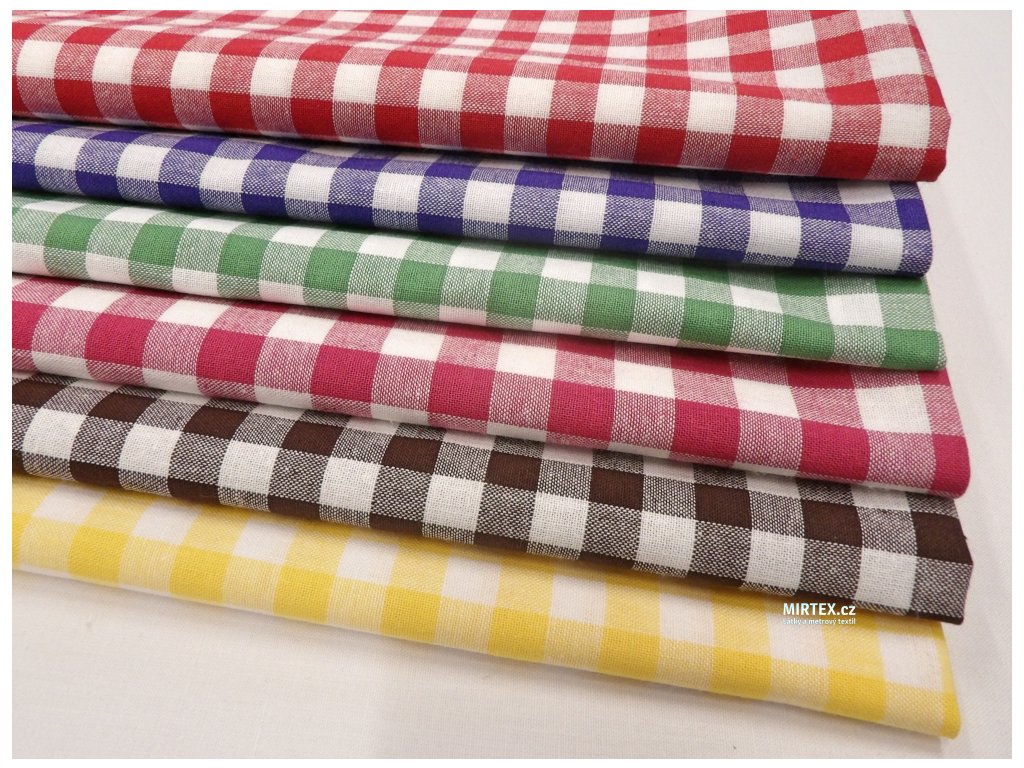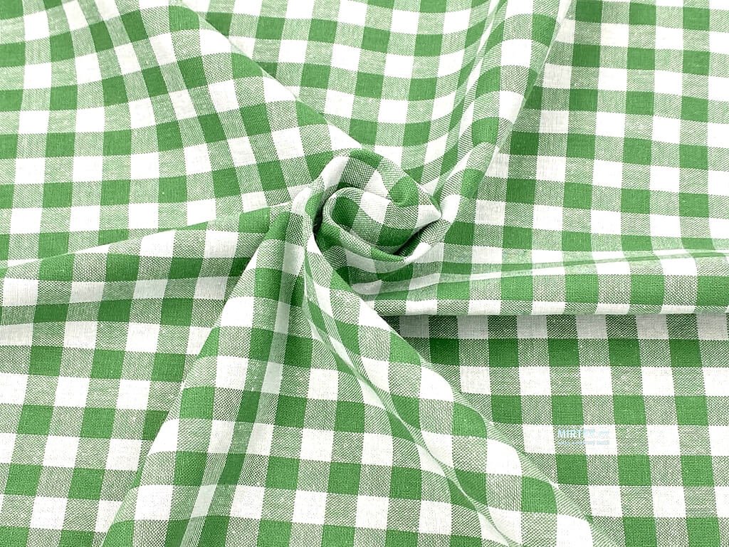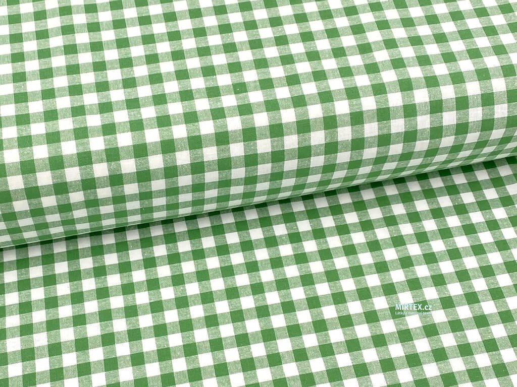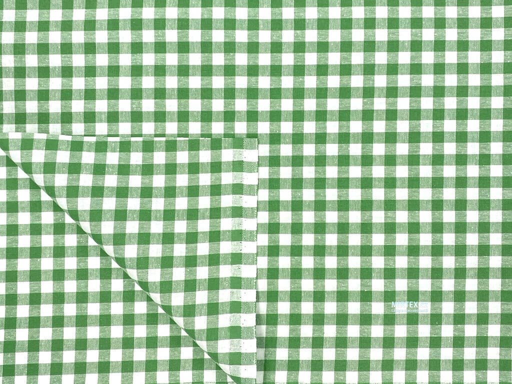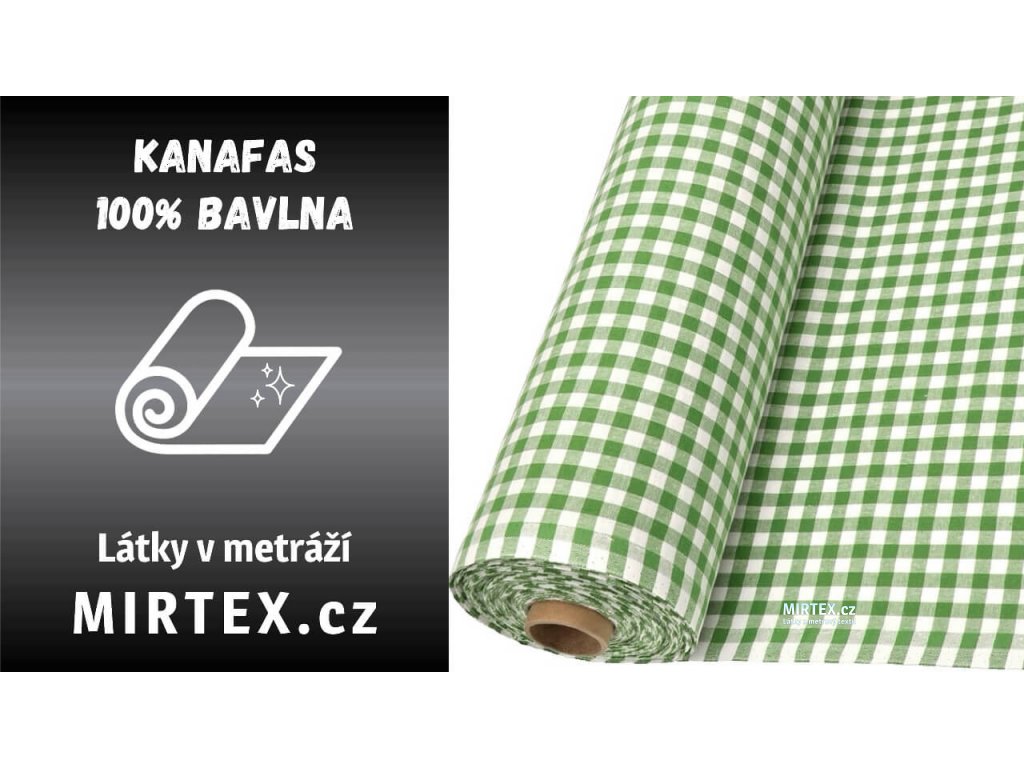 Kvalitní bavlněná žakárová tkanina v plátnové, pestře tkané vazbě s zeleno-bílou kostkou o velikosti 8–10 mm, určená především pro výrobu ubrusů, zástěr, závěsů, retro povlečení a dalšího kuchyňského a domácího textilu.
