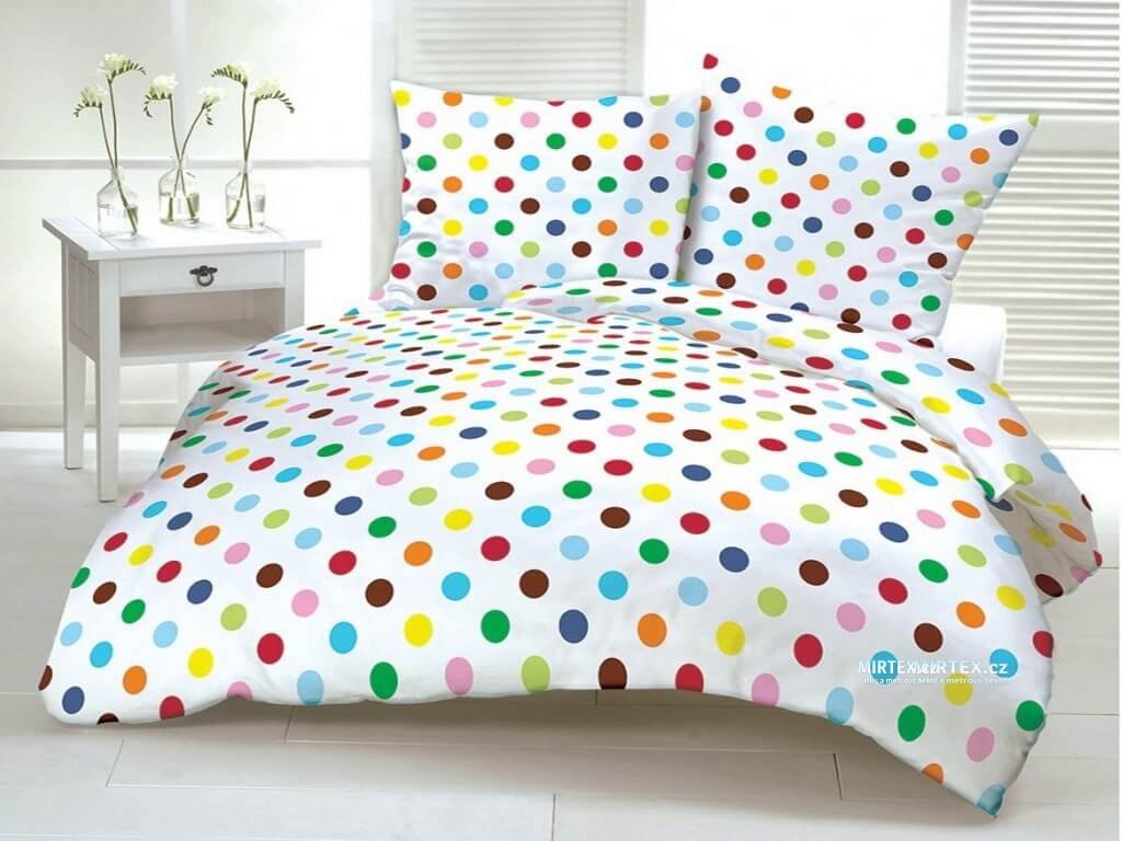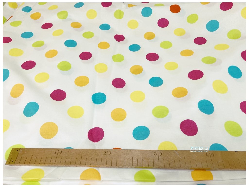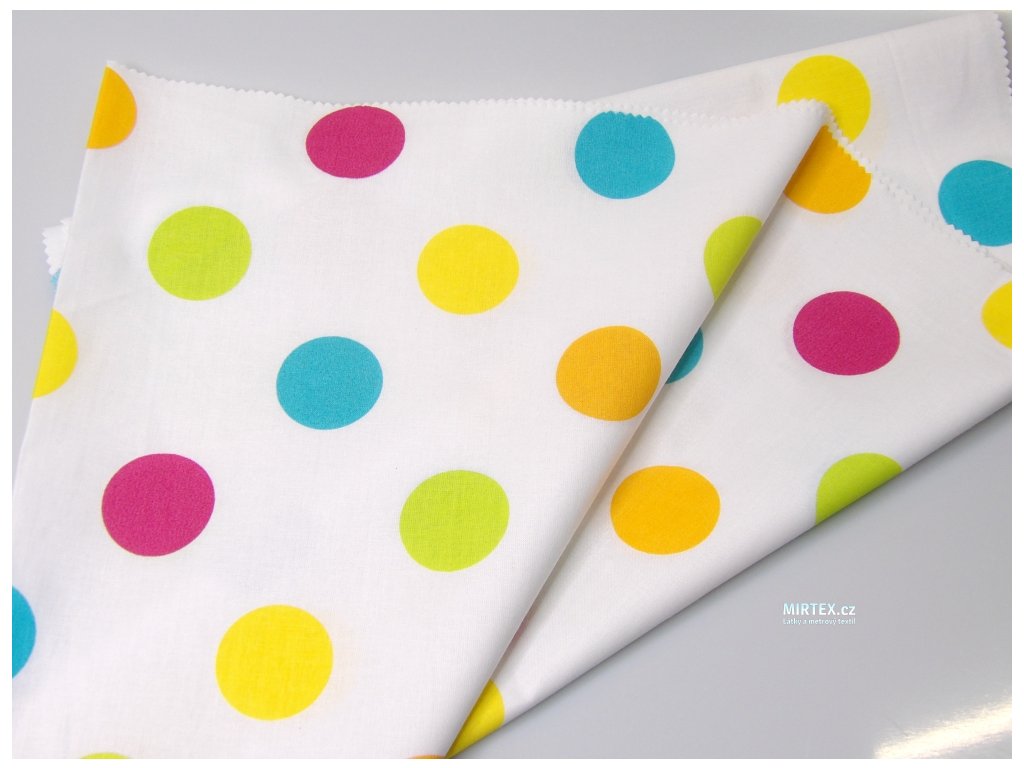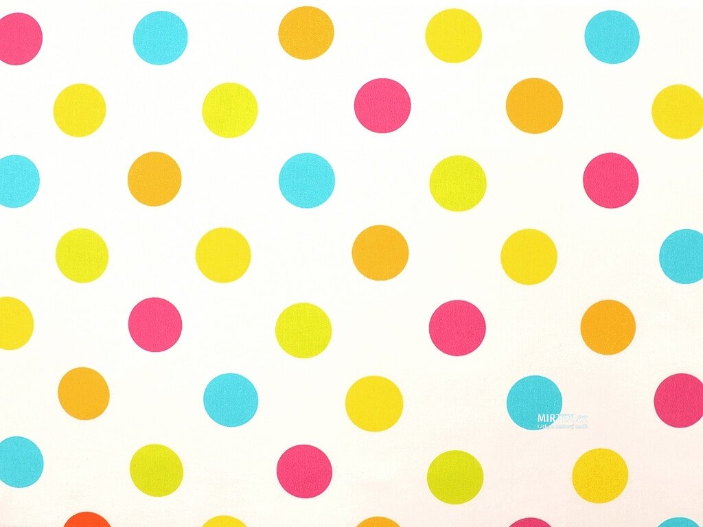 Vzor: Barevné puntíky na bílém podkladu - pestré, živé, s puntíky v růžové, modré, žluté a oranžové barvě, rovnoměrně rozmístěné.
