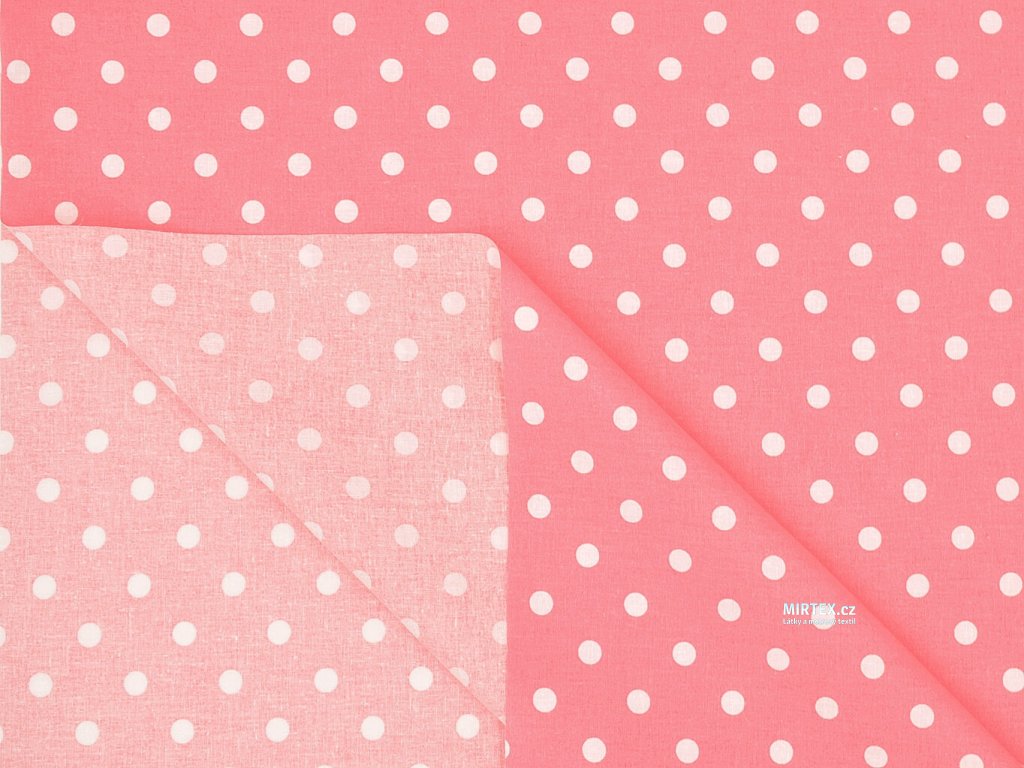 Barva a vzor: univerzální klasický dezén bílé puntíky (polka dot) o velikosti 10 mm na růžovém podkladu.
