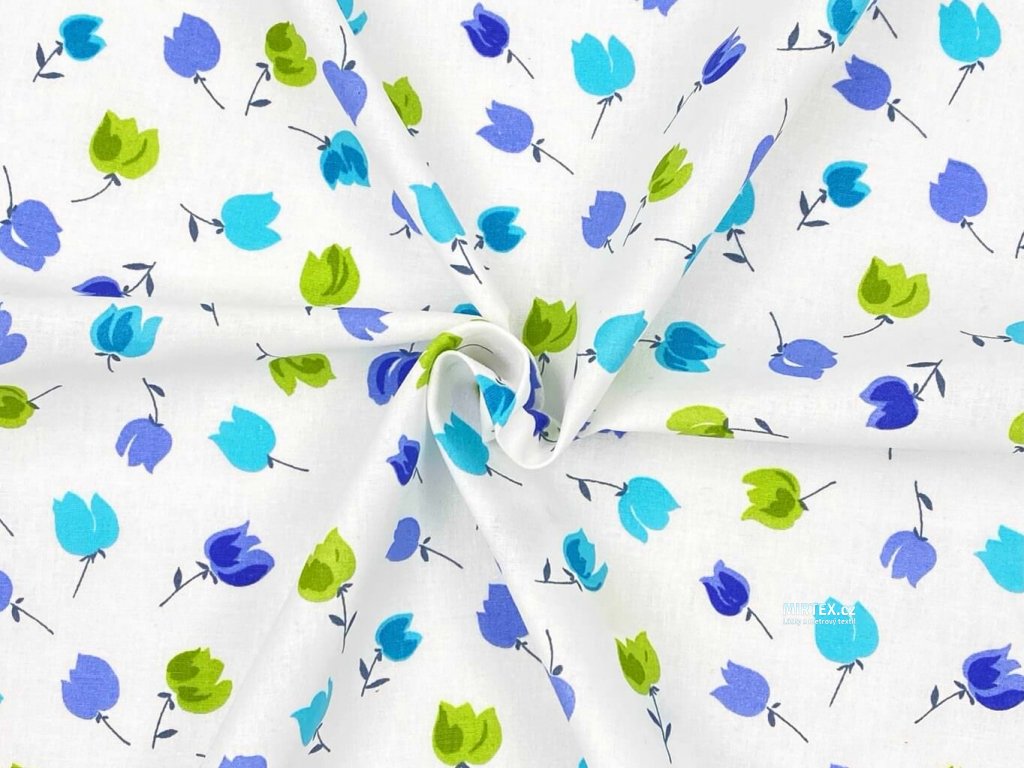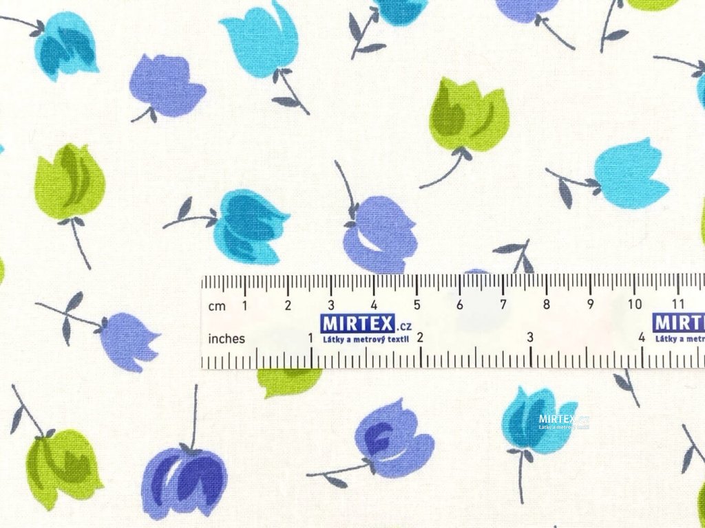 Barva a vzor: Drobná kvítka v modrých a zelených odstínech na bílém podkladu.