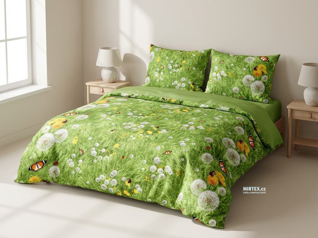 Barva a vzor: 3D "Letní louka" s realistickým tiskem pampelišek, sedmikrásek, motýlů a berušek v husté, živé zelené trávě. Díky pokročilé 3D technologii tisku působí motivy velmi plasticky a autenticky, ideální pro originální textilní projekty, které chtějí vyniknout.